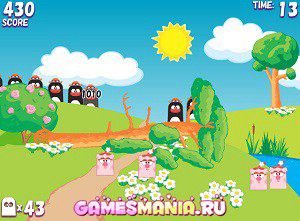 Машина Пина, которая должна была делать игрушки со смешариками, сломалась. Она захватила его и всех друзей, создала множество их клонов. Двойники заполнили дома, сады, парки смешариков. Вам нужно успеть за 40 секунд собрать минимум 100 смешариков, чтобы очистить каждый уровень. В конце освободите смешариков, проникнув внутрь деталей машины.